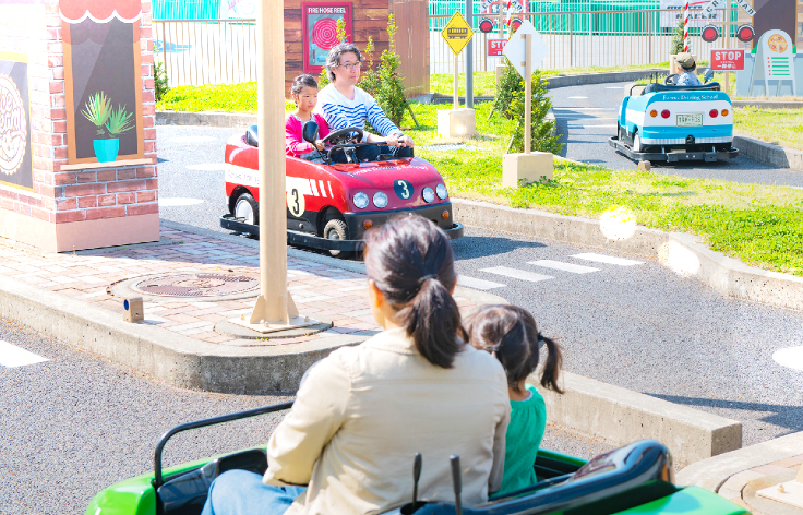 森の教習所は、4輪のクルマを運転しながら交通ルールを守ってポイントを稼ぐアトラクション。