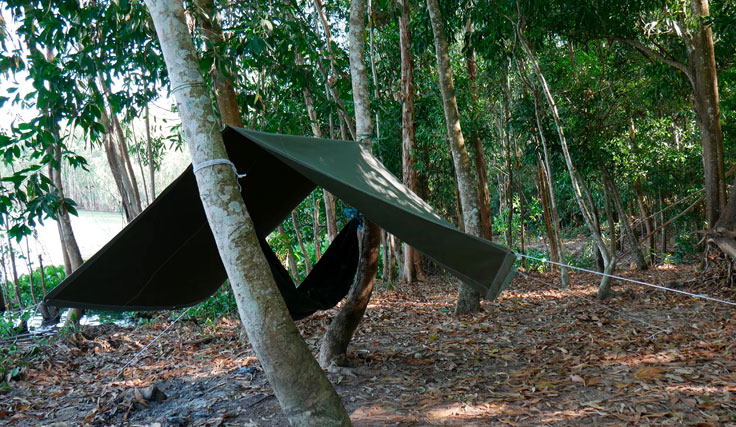 設営の難易度は少し上がりますが、「スクエアタープ」もオススメです。これは、正方形のタープで、4本から6本の支柱を立て、そのすべてにロープを張って使用します。先程のヘキサタープと違って支柱の本数が変わるため、設営には少し時間がかかります。ですが、ほかのタープとは異なり、大きな面積のため、居住性に優れているのが特徴です。