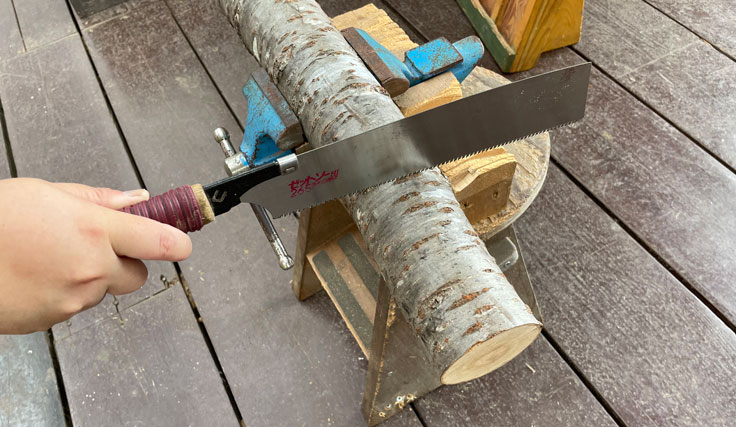 胴体となる木材を選んだら、ノコギリで好みの大きさに切っていきます。のこぎりは、引く時に力を入れて、押す時は優しくがポイント。