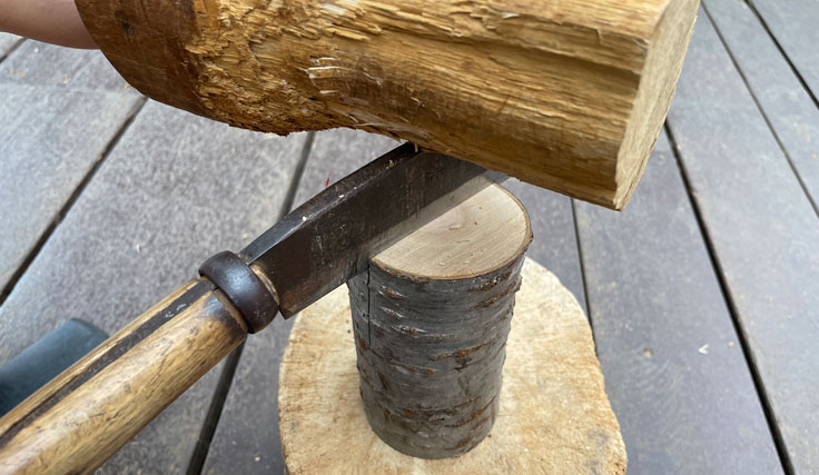 胴体が好きな大きさに、木材を切ることができたら、次はナタを使ってそれを半分に割ります。ナタでどの向きに割るかによっても、木の皮の模様が変わってくるので、じっくり考えてから切っていきます。