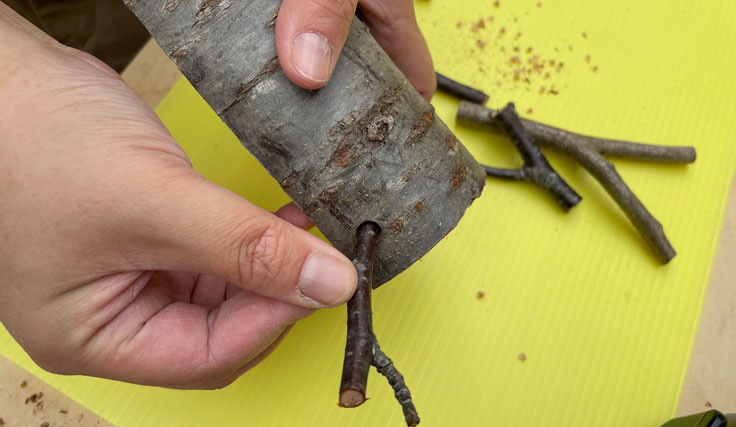 電動ヤスリできれいに磨くことができたら、次は「脚」にあたる部分を作っていきます。脚として使う小枝を材料置き場から選んで、せん定バサミで好みの長さに切っていきます。その後、電動ドリルで穴をあけて、小枝を差し込んでいきます。木材は自然のものなので、時にはドリルで穴をあけてもきれいに入らないことも。1本1本小枝を差し込んでいくのがなかなか難しかったです!せん定バサミや、電動ドリルなどの道具を気をつけながら使って、親子で一生懸命作っていくのが良いでしょう。