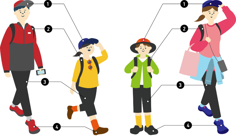 因為步行距離較長,建議穿著習慣的運動鞋或登山鞋。由於柏油路可能會變熱,且有時需要在人群中行走,因此不推薦穿涼鞋。
